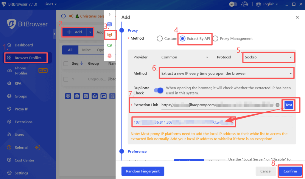 ② Extract by API → select the Protocol, Method etc, → Paste the extracted link from the JibaoProxy platform → click “Test” → click “Confirm” to save the browser profile.