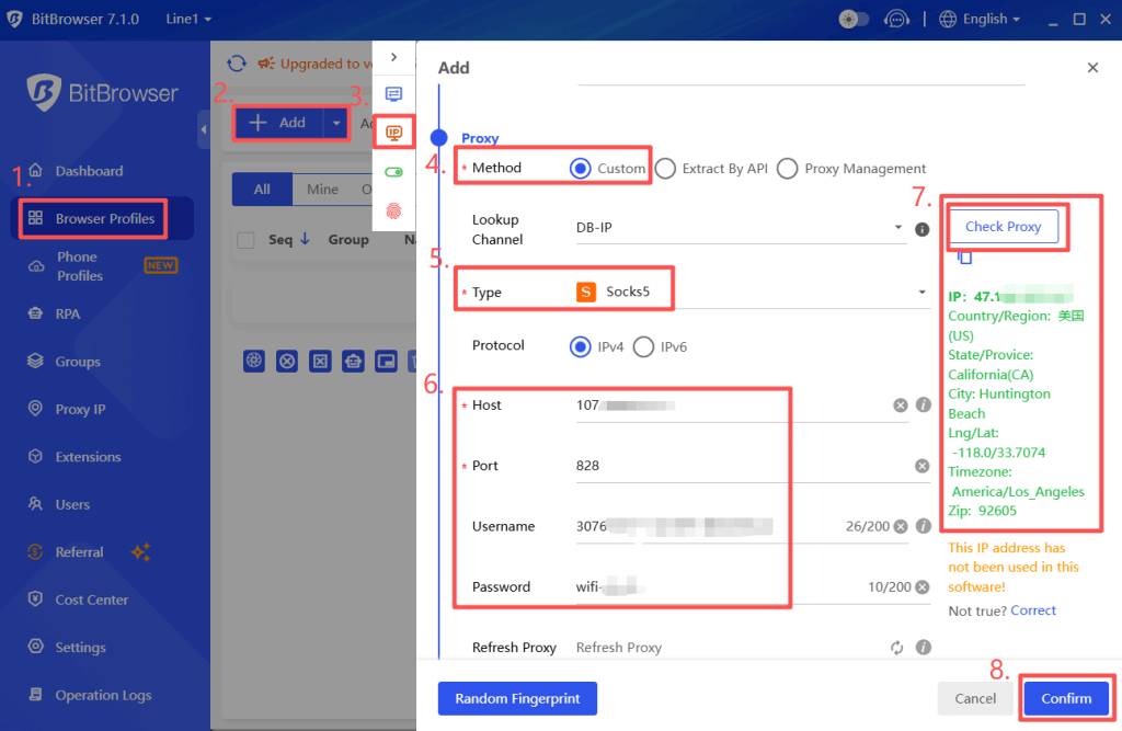 ① “Custom” the proxy→ select the Proxy Type → Paste the JibaoProxy information → click “Check Proxy” → click “Confirm” to save the browser profile.