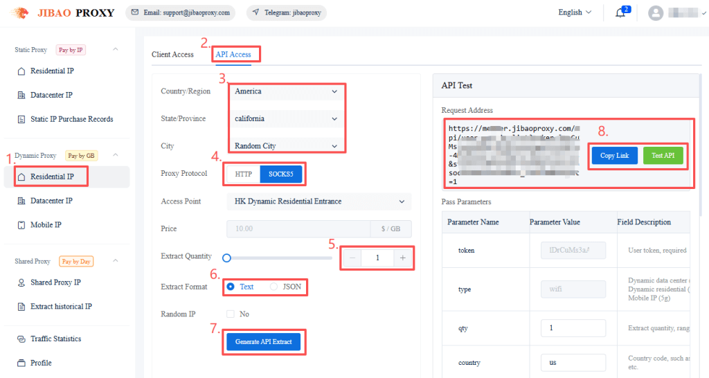(2) API Access → Choose region, proxy protocol, etc → Enter the quantity and format to extract → Click “Generate API Extract” → Copy the link.
