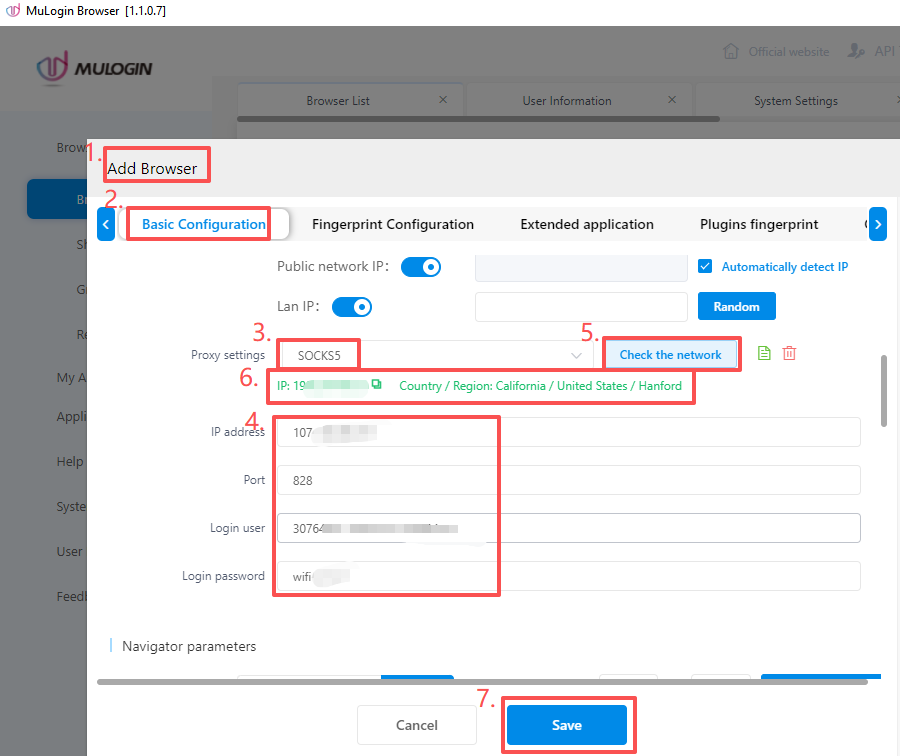 6. In the left sidebar, click “Browser List” → Add browser → Proxy settings → Proxy type → Paste the JibaoProxy information → click “Check the network” → click “Save” to save the profile.