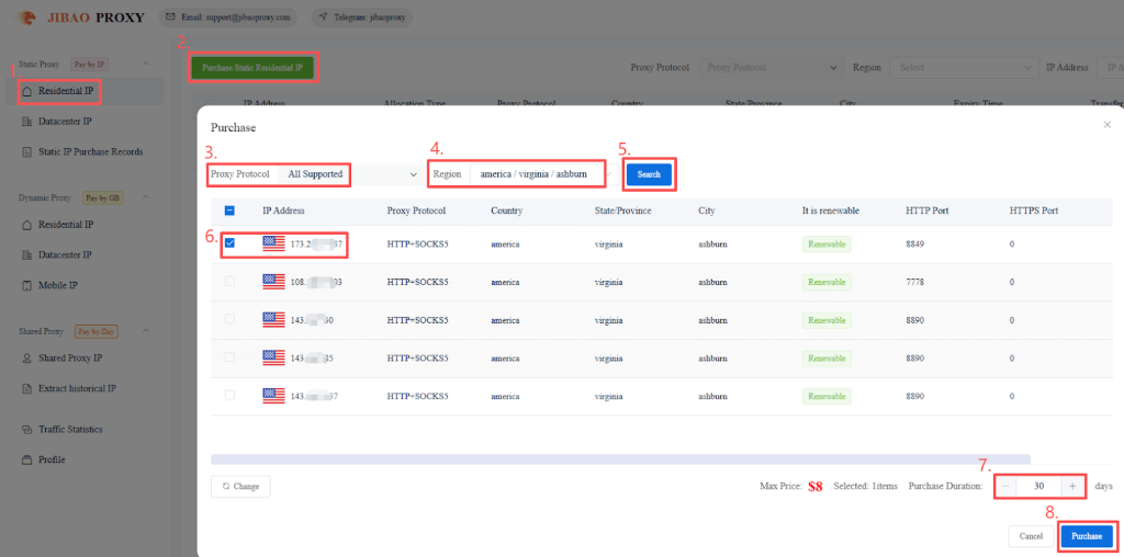- Select the “IP(s)” and “usage duration”, then click “Purchase”