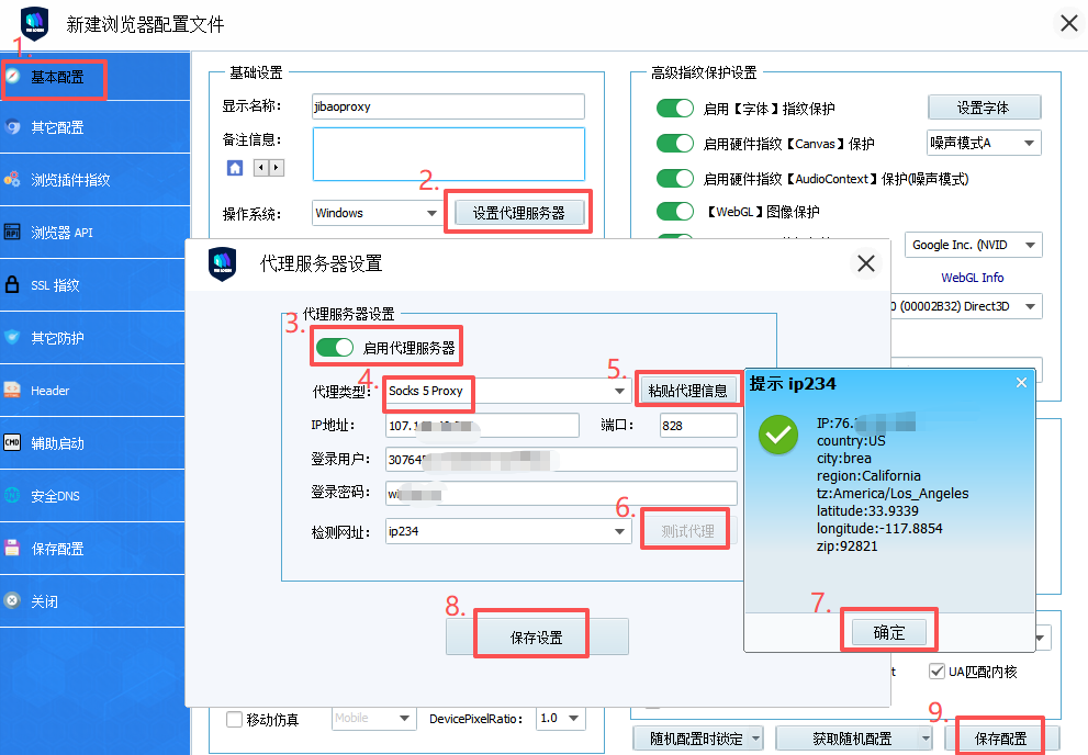 7. 点击“设置代理服务器” → 启动代理服务器 → 选择“代理类型” → 粘贴JibaoProxy代理信息 → 点击“测试代理”,测试成功后确认并保存代理配置 → 保存浏览器。